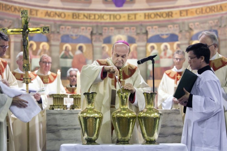 In de Chrismamis wijdt de bisschop het chrisma: